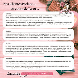 Pour aussi peu que 10$ par cours plonge dans l’univers fascinant du tarot avec Océane et découvre ses mystères, des origines anciennes de ses cartes jusqu’à leur maîtrise profonde. Ce cours (13 séances de 1:30 à 2 h, en ligne) t’accompagne pas à pas : compréhension des arcanes, tirages intuitifs, symbolisme caché… Apprends à lire le tarot non pas comme un simple outil divinatoire, mais comme un véritable guide de sagesse et d’introspection. Que tu sois débutant ou déjà initié, ce voyage te permettra de développer une lecture fluide et éclairée, en harmonie avec ton intuition. * tous les cours sont enregistrés et disponibles en rediffusion